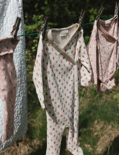 Made from 100% organic cotton, this long-sleeved jumpsuit is designed as a one-piece for everyday wear. It features a wrap-over V-neck secured with snap buttons along the side and down one leg for straightforward dressing and changes. Integrated feet provide full coverage, and the edges are finished with delicate picot trim. The all-over floral print completes the simple design and works well for layering.- Long sleeves and built-in feet for full coverage- Wrap-over front with side snaps down the leg for easy dressing- All-over floral print with picot-edged trims- Contains 100% Cotton Organic GOTS. GOTS Organic, certified by Control Union, 842535.