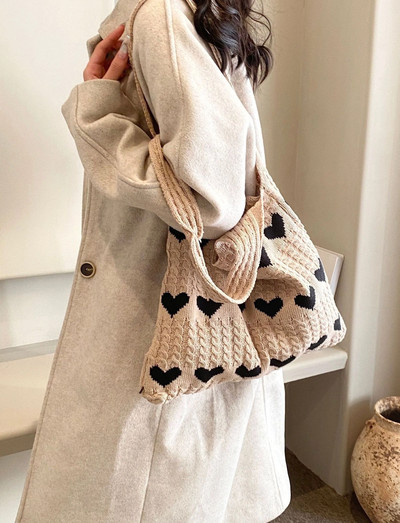 Charming and spacious knitted bag with beautiful heart patterns. A cute and practical accessory that adds that little extra to your outfit!