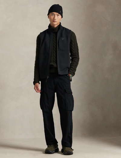 Diese Weste aus superglattem Doppelstrick bietet außergewöhnlichen Komfort und einen edlen Look. Sie verfügt über einen durchgehenden Reißverschluss vorne, einen Stehkragen mit elastischer Baumwollrippung und mehrere Reißverschlusstaschen zur sicheren Aufbewahrung. Ein charakteristischer Leder-Schild-Patch sorgt für einen Hauch von ikonischem Stil.