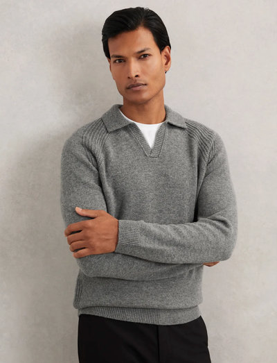 Dieser Pullover aus einem Woll- und Kaschmirgemisch bietet ein luxuriöses Gefühl und ein entspanntes Design. Er verfügt über einen offenen Kragen und Rippdetails an Saum und Bündchen, was seinen lässigen Reiz verstärkt und für eine bequeme Passform sorgt.