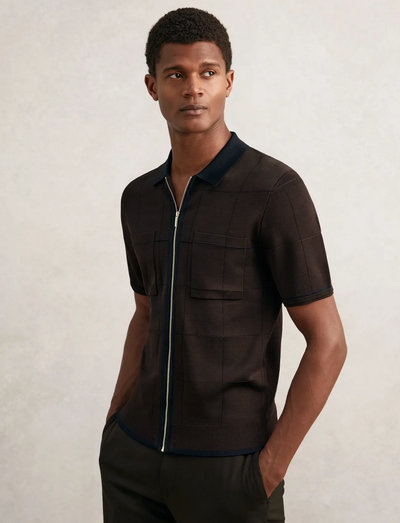 Dieses Strickhemd aus einem kompakten, dehnbaren Stoff besticht durch eine markante Fensterkaro-Textur. Kontrastfarbene Paspelierungen und ein Reißverschluss vorne sorgen für eine moderne Note, während aufgesetzte Brusttaschen das Design abrunden.