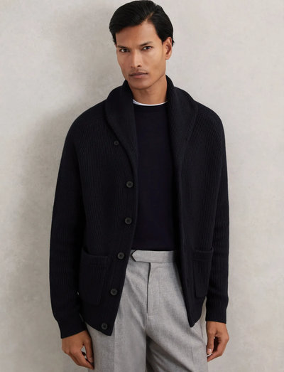 Diese Strickjacke aus Wolle mit durchgehend gerippter Struktur bietet eine raffinierte Interpretation des Styles für kühles Wetter. Sie verfügt über einen weichen Schalkragen, aufgesetzte Taschen vorne für zusätzlichen Komfort und eine durchgehende Knopfleiste, die geschlossen werden kann, um einen hohen Halsausschnitt zu schaffen.