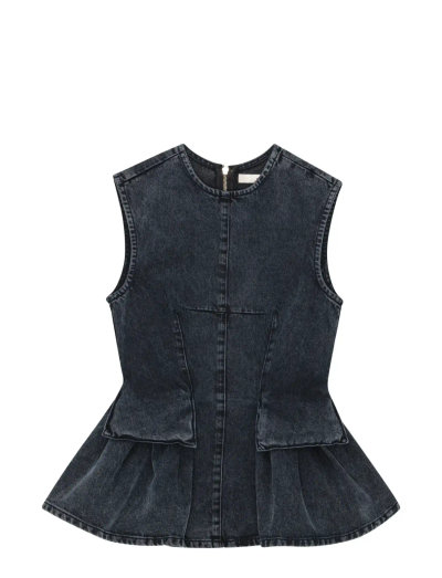 Dieses Jeansoberteil mit Schößchensaum und strukturierter Silhouette verleiht einem klassischen Stoff eine moderne Note. Das ärmellose Design und der Reißverschluss hinten machen es zu einem vielseitigen Kleidungsstück zum Layern oder zum Solotragen.
