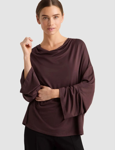 Dieses Oberteil bietet eine entspannte Silhouette und einen stilvollen Wasserfallausschnitt. Der leicht verkürzte und kastenförmige Schnitt wird durch lange, lockere Ärmel ergänzt.