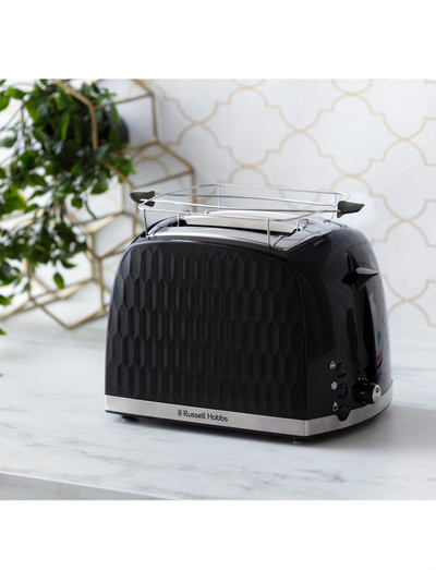 With its unique textured plastic design and chrome accents, the Honeycomb Toaster adds a stylish touch to your kitchen. It comes equipped with a range of practical features to meet your everyday needs, including a defrost function, reheat function, and a cancel button to stop toasting at any time. A warming rack is also included.
