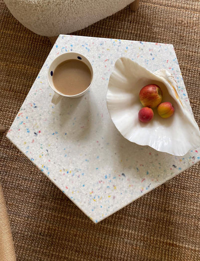 Annie table terrazzo is made from 100 pct. recycled and recyclable plastic, mainly from cosmetic packaging. it is designed and produced in denmark. the colors originate from the original plastic, and that is why no annie table terrazzo is the same.