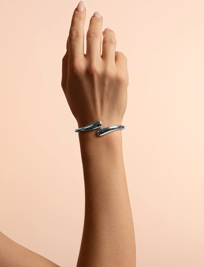Ein schlankes, glänzendes Metall wertet dieses minimalistische Armband auf. Die organische Form und das leichtgängige Scharnier verbinden Design mit alltäglicher Funktionalität.