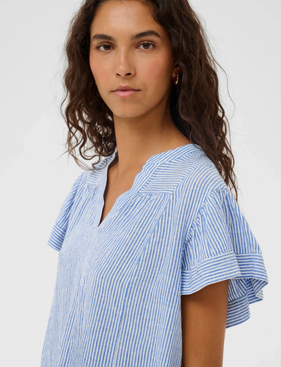 Volantärmel und ein dezenter V-Ausschnitt verleihen dieser gestreiften Bluse eine luftige, feminine Note. Das leichte Material macht sie ideal für warmes Wetter, während die lockere Passform für ganztägigen Komfort sorgt.