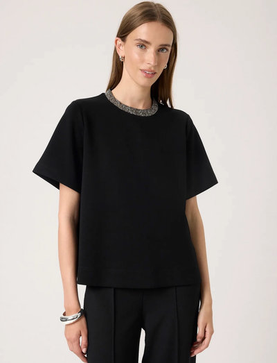 Ein Hauch von Glitzer wertet dieses kurzärmelige Oberteil auf. Der verzierte Ausschnitt sorgt für ein raffiniertes Detail und macht es perfekt für schicke und lässige Anlässe.