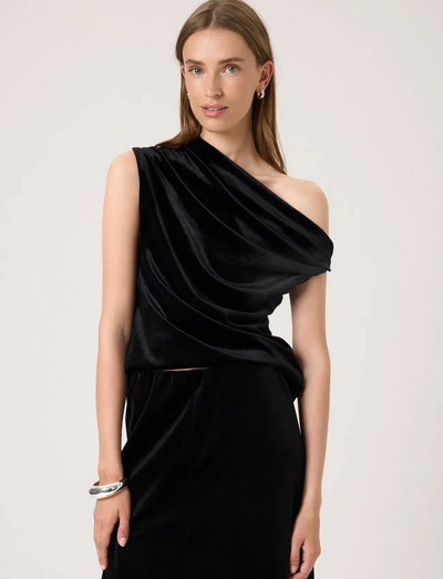 Dieses Top aus weichem Samt zeichnet sich durch ein elegantes One-Shoulder-Design mit dezenten Drapierungen aus. Eine stilvolle Wahl für Abendveranstaltungen, die gut zu einer massgeschneiderten Hose oder einem Rock passt.