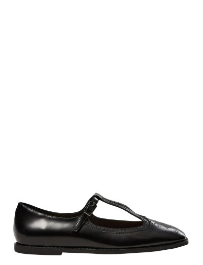 Ein zeitloses T-Spangen-Design zeichnet diesen Ballerina-Schuh aus. Der Schuh verfügt über eine eckige Spitze, ein glänzendes Finish und Brogue-inspirierte Perforationen, alles auf einer flachen Sohle. Gefertigt aus reinem Leder mit einer Gummisohle.