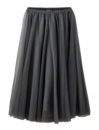 Dieser Maxirock ist aus mehreren Lagen transparentem Tüll gefertigt und bietet einen eleganten Fall und einen Hauch von ätherischem Charme. Die A-Linien-Silhouette sorgt für eine schmeichelhafte Passform, während der elastische Bund für einen bequemen Sitz und eine leichte Fülle sorgt.