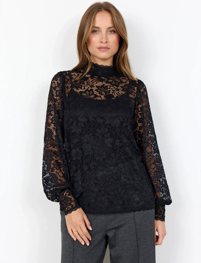 Feine Spitze definiert diese Bluse und macht sie zu einer eleganten Wahl für jeden Anlass. Der hohe Halsausschnitt und die langen Ärmel tragen zu ihrer raffinierten Ästhetik bei. Gefertigt aus einer Mischung aus Polyamid und Elastan, bietet dieses Kleidungsstück sowohl Komfort als auch Stil. Kombinieren Sie sie mit einer Hose oder Jeans, um vielseitige Looks zu kreieren.