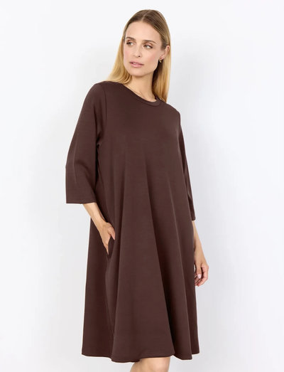 Dieses lässige Kleid ist aus einer angenehmen Mischung aus Modal, Polyester und Elastan gefertigt und hat eine schmeichelhafte Midi-Länge. Das Design verfügt über einen runden Ausschnitt und lockere Dreiviertelärmel, wodurch es sich ideal zum Tragen mit Leggings und einer Weste eignet.