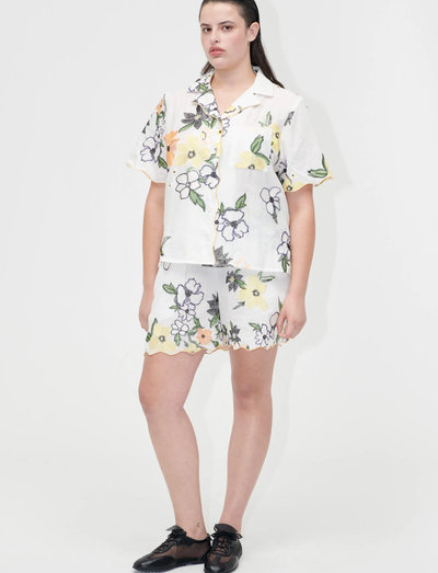 Diese leichten Shorts sind mit zarten Blumenstickereien versehen und perfekt für warmes Wetter. Sie verfügen über einen bequemen elastischen Bund mit verstellbarem Kordelzug, gewellte Kanten und praktische Seitentaschen.