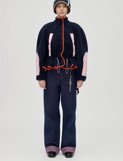 Diese Fleecejacke zeichnet sich durch ihre markante Silhouette aus und verfügt über kontrastierende Details für einen ausdrucksstarken Look. Das Design umfasst einen hohen Kragen und einen Druckknopfverschluss, ergänzt durch eine verstellbare Taille, um eine bequeme und schmeichelhafte Passform zu gewährleisten.