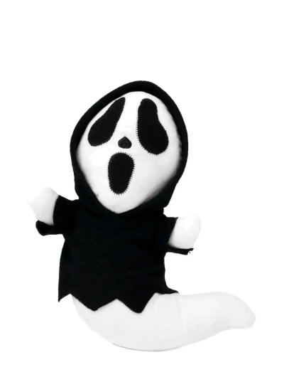 A creepy cuddly stuffed plush in short-haired fur pile shaped like a ghost with an open mouth and a face that lights up in the dark.