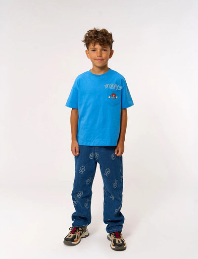 Oversized blue t-shirt from THE NEW with a playful and unique design. The front features a chest pocket with a smiley giving a peace sign, wearing a cap with the text "YOLO." Above the pocket is the text "Winner." The back features an enlarged version of the smiley print along with the phrase "worry less," adding a relaxed and positive vibe. Perfect for everyday wear and fun occasions. - Oversized fit for extra comfort - Chest pocket with fun details - Enlarged print on the back with the phrase "worry less" - GOTS Organic certified by CU842535