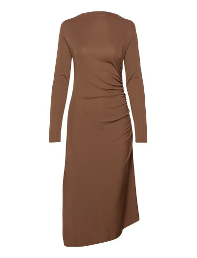 Dieses langärmlige Kleid mit schmeichelhafter Silhouette zeichnet sich durch dezente Raffungen an der Seite aus, die für einen Hauch von Textur und optisches Interesse sorgen. Der asymmetrische Saum verleiht diesem vielseitigen Kleidungsstück eine moderne Note.