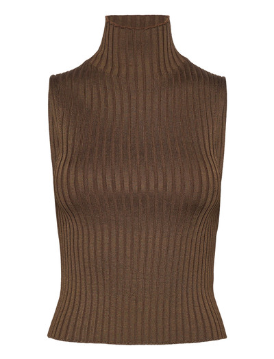 This mock-neck vest is crafted from a fine-gauge viscose blend yarn, offering a sleek and modern silhouette. The body and neckline are knitted in a refined rib stitch, while the bottom hem is finished with a clean self-start for a minimalist look. Narrow rib stitch detailing at the armholes and fully fashioned construction add subtle sophistication, complemented by a French shoulder with fully fashioned detailing. Designed to sit at hip length, the vest combines precision craftsmanship with understated elegance.