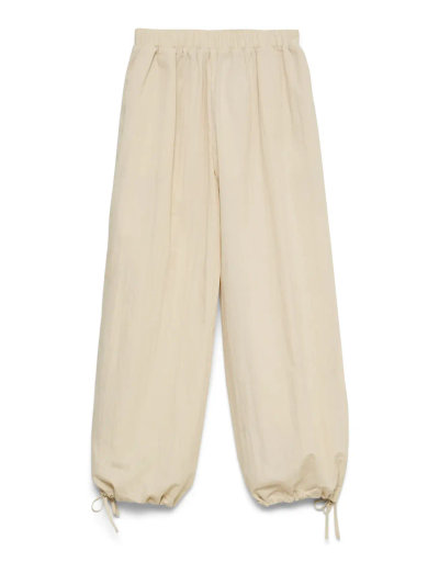 Diese gewebte Hose bietet eine entspannte Silhouette und verfügt über einen bequemen elastischen Bund. Das Design mit weitem Bein wird durch verstellbare Bindedetails an den Knöcheln ergänzt, was eine individuelle Passform ermöglicht.