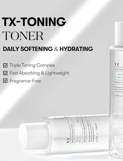 TX-Toning Toner is a refreshing and brightening toner designed to even skin tone and improve texture. Infused with active ingredients like tranexamic acid, niacinamide, and glutathione, it helps reduce dark spots, control oil, and hydrate the skin while strengthening the skin barrier. Suitable for daily use and all skin types.
