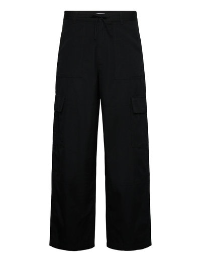 A pair of baggy-fit cargo trousers with utilitarian detailing. Crafted from ripstop cotton, they feature an elasticated drawstring waistband with belt loops, a zip fly, and multiple flap and patch pockets. Designed with articulated knee seams for added structure.