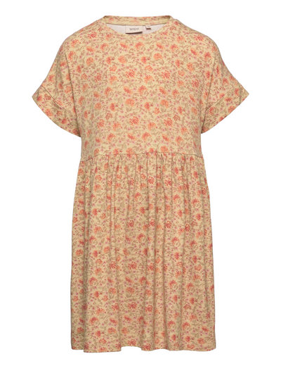 Wheat Short-sleeved dress in soft viscose for the junior child. It has a sweet hand drawn all-over flower print made by our in-house designteam. The dress has a flattering cutline above the waist with gatherings, which gives the dress some lovely volume and falls nicely above th