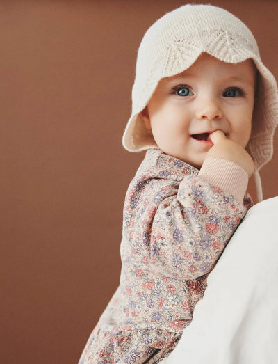 Knitted bonnet with lady shadow and tie strings in soft merino wool for babies. - Bonnet with lady shadow - Cabel knit details- Double layered tie stringsWheats hats is both comfortable and practical for the cold autumn and winter season. ---100% Extra fine merino wool
