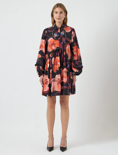 Dieses Kleid mit einem lebhaften Allover-Print bietet eine entspannte Passform für ein angenehmes Tragegefühl. Es ist mit langen Ballonärmeln, elastischen Bündchen und einer Knopfleiste vorne ausgestattet und mit einem eleganten Hemdkragen versehen.