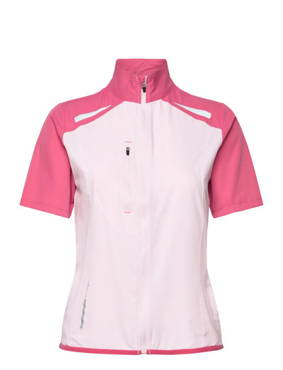 Dieses Stretch-Windshirt ist aus einem dünnen, winddichten Gewebe mit mechanischem Stretch gefertigt, was ausgezeichnete Bewegungsfreiheit bietet. Der Hauptteil ist durchgehend mit einem transparenten Muster bedruckt, das durch einen einfarbigen Kontraststoff an Ärmeln und Schultern ergänzt wird. Es verfügt über einen durchgehenden Reissverschluss vorne und eine Brusttasche mit Reissverschluss zur sicheren Aufbewahrung. Der elastische Saum sorgt für eine gute Passform, während dezente Logos unten rechts und in der hinteren Mitte platziert sind.
