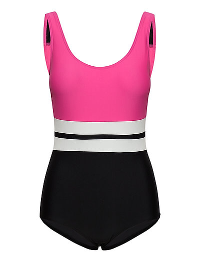 Swimsuit in a nice block design. The swimsuit has lightly padded, removable cups that lifts and gives a nice support for the bust. De low cutted leg ends covers nicely and makes the swimsuit perfect for activity. The mesh lining in the front gives extra support and a flattering fit. Fits perfect in bigger sizes.