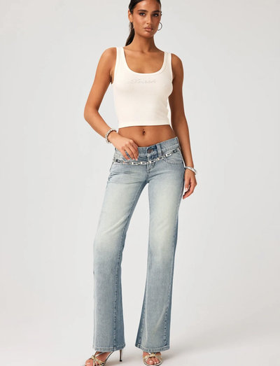 Flare fitDiese Jeans bietet eine schmeichelhafte Silhouette mit einer super niedrigen Taille und einem ausgestellten Bein. Das klassische Fünf-Taschen-Design verleiht diesem stilvollen Stück einen Hauch von Funktionalität.