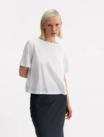 Dieses kurzärmlige T-Shirt ist aus einem leicht durchsichtigen Viskosegemisch gefertigt und hat eine glänzende Oberfläche, die ins Auge fällt. Es ist mit einem schmeichelhaften U-Boot-Ausschnitt und einer leicht verkürzten Länge versehen, was eine klare und moderne Silhouette ergibt. Ein vielseitiges Kleidungsstück für das ganze Jahr.