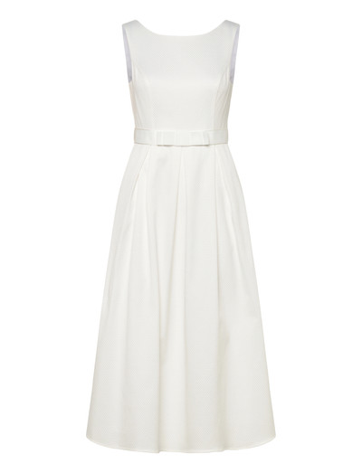 Dieses Kleid besticht durch eine schmeichelhafte A-Linien-Silhouette mit einem figurbetonten Oberteil, das in einen wunderschön plissierten Rock übergeht. Das ärmellose Design macht es perfekt für wärmere Tage oder zum Kombinieren mit Ihrer Lieblingsjacke.
