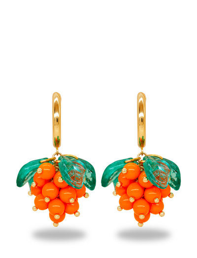 Diese Ohrringe haben eine Traube orangefarbener Beeren mit grünen Blättern, die an einem goldenen Reifen hängen. Sie sind ein lustiges und stilvolles Accessoire für jeden Anlass.