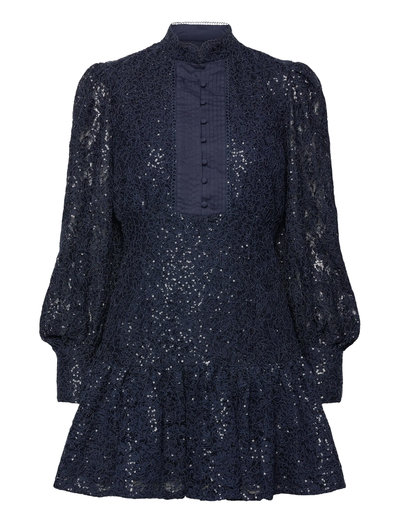 Dieses Minikleid ist mit zarten Stickereien versehen und verfügt über einen hohen Kragen und eine Knopfleiste. Das Design umfasst Puffärmel mit Knopfmanschetten und einen figurbetonten Rock mit verspielter Rüsche.