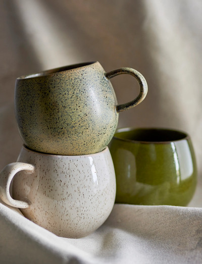 The Addison Mug by Bloomingville is a charming set consisting of three stoneware mugs in shades of green, white, and greenish-brown. Each mug is designed with an inviting round shape and a handle that provides a comfortable grip. The reactive glaze on the mugs adds a dynamic expression, making each mug unique.