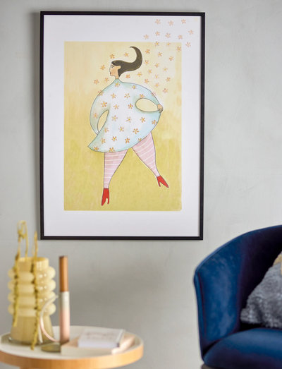 The Ajo Illustration with frame by Bloomingville is an artistic poster, illustrated by our own designers. The illustration is in fine pastel colors and depicts a woman with flowers flying off her shirt. The frame is made of pine wood in black, which beautifully contrasts with the illustration's light shades and highlights the motif.