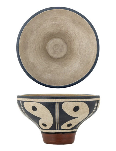 The Elfrida Bowl by Bloomingville is made of terracotta with a deep black base and decorative patterns in warm, sandy shades. The raw surface and high base give the Bowl a characterful touch. The nature of the glaze can cause variations in color, ensuring that each Bowl is unique.