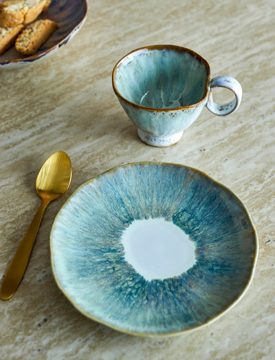 The Imogen Plate by Bloomingville is a stoneware piece finished with a reactive glaze, creating a textured surface with curved, uneven edges, A soft beige center is framed by green tones with subtle blue and brown accents, Small variations in pattern and color intensity may occur, making each piece unique,
