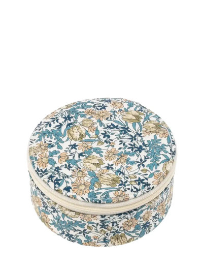 Bewahren Sie Ihre wertvollen Schmuckstücke sicher in dieser runden Schmuckschatulle auf. Sie verfügt über einen Reissverschluss und ist mit einem zarten Blumenmuster verziert, das perfekt ist, um Ihrem Schminktisch einen Hauch von Eleganz zu verleihen.