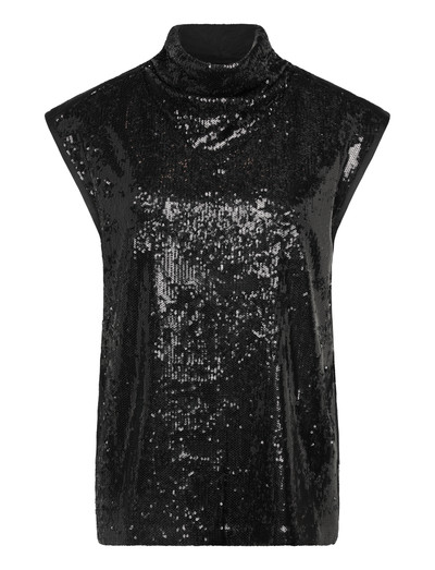 Schimmernde Pailletten machen dieses ärmellose Top zu einer herausragenden Wahl für Abendveranstaltungen. Der hohe Halsausschnitt verleiht diesem auffälligen Teil einen Hauch von Eleganz.