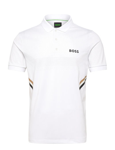 Schnell trocknendDieses BOSS GREEN Poloshirt bietet hohe Performance und Komfort. Es ist aus innovativem S.CAFE-Gewebe gefertigt. Das Shirt verfügt über eine dauerhafte Geruchsregulierung und schnelltrocknende Eigenschaften. Es bietet außerdem UV-Schutz. Das Poloshirt hat einen Aufdruck und Streifen. Ein großes BOSS-Logo ist auf der linken Brust aufgedruckt.