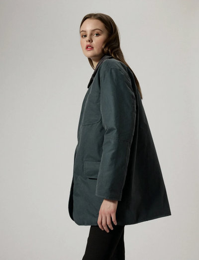 WasserabweisendDiese Oversized-Jacke wird in Birmingham, UK, gefertigt und verfügt über ein wasserabweisendes Obermaterial aus GOTS-zertifizierter Bio-Baumwolle. Sie ist wattiert und teilweise mit recyceltem Polyester gefüttert, das nach dem Global Recycle Standard zertifiziert ist und aus wiederverwerteten Textilabfällen gewonnen wird. Corddetails an Kragen und Innenbündchen sowie seitliche Pattentaschen. Um die Qualität zu erhalten, sollte das Obermaterial regelmässig neu gewachst werden.