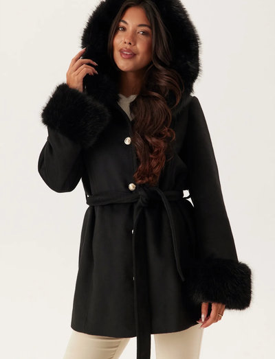 Hooded coat in wool by BUBBLEROOM- Gently fitted fit- Removable tie band at the waist- Button closure at the front- Pockets at the front- Hood with a removable faux fur- Detachable faux fur on the sleeve ends- Lined- Length from shoulder: 80 cm in size S- The recycled polyester in this product is certified by a third party. Recycled polyester is mainly produced from recycled PET bottles or from production waste from the manufacturing process. By using materials that are already in circulation, we can save natural resources.