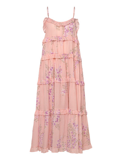 Dieses Maxikleid ist aus weichem, leichtem, GRS-zertifiziertem Stoff gefertigt und verfügt über dünne Schulterträger und eine schmeichelhafte A-Linien-Silhouette. Dekorative Rüschen fallen das Kleid hinunter und verleihen ihm einen Hauch von verspielter Eleganz.
