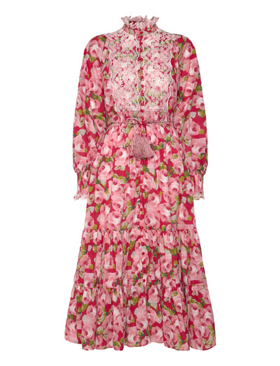 Dieses Midikleid aus leichtem und weichem, GOTS-zertifiziertem Baumwollstoff besticht durch dezente Slub-Details. Es verfügt über einen voluminösen Rock, dreiviertellange Ärmel mit elastischen Bündchen und einen Mandarin-Kragen mit Rüschendetail. Das Design wird durch eine taillierte, gesmokte Taille und ein Bindeband mit Quasten sowie hübsche Broderie-Anglaise-Einsätze abgerundet.