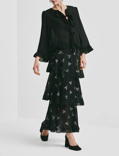 Dieser Maxirock ist aus zartem, strukturiertem, FSC-zertifiziertem Viskose-Georgette gefertigt und verfügt über voluminöse Volants für eine fliessende Silhouette. Jeder Volant ist mit einer zarten Spitze entlang des Saums versehen. Der Bund ist gesmokt. Er verfügt über einen seitlichen Reissverschluss.