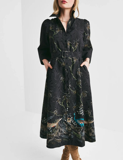 Dieses Midikleid ist aus einer FSC-zertifizierten Baumwoll- und Viskosemischung gefertigt und verfügt über ein dekoratives Jacquardmuster. Es hat eine entspannte Passform, einen Hemdkragen, eine Knopfleiste vorne und weite, lange Ärmel mit eckigen Manschetten. Ein passender Gürtel vervollständigt den Look.